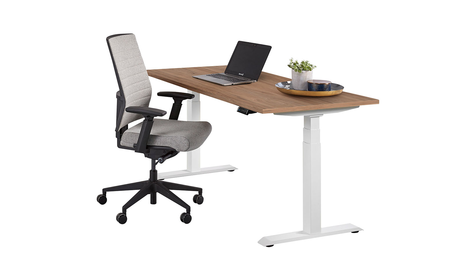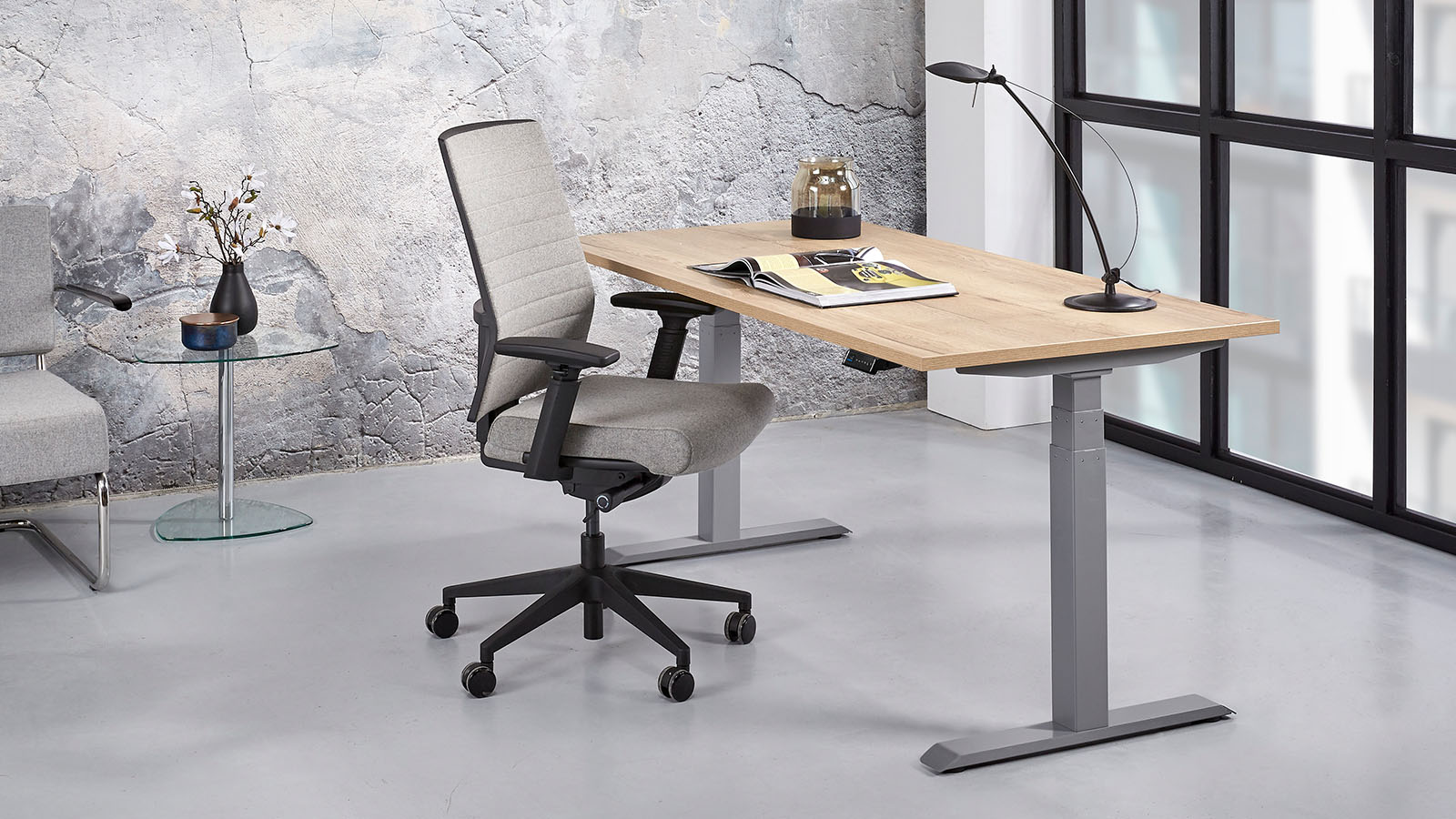 starke Ausstattung: Die 2 Motoren sorgen synchron für die elektrische Höhenverstellung. Dadurch, dass hier 2 Motoren „an Bord“ sind, können sie so klein gebaut werden, dass sie optisch nicht als hervorstehende Blöcke stören, sondern im Gestell verschwinden